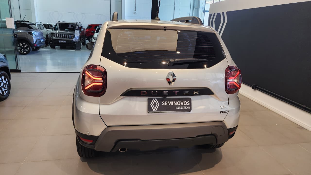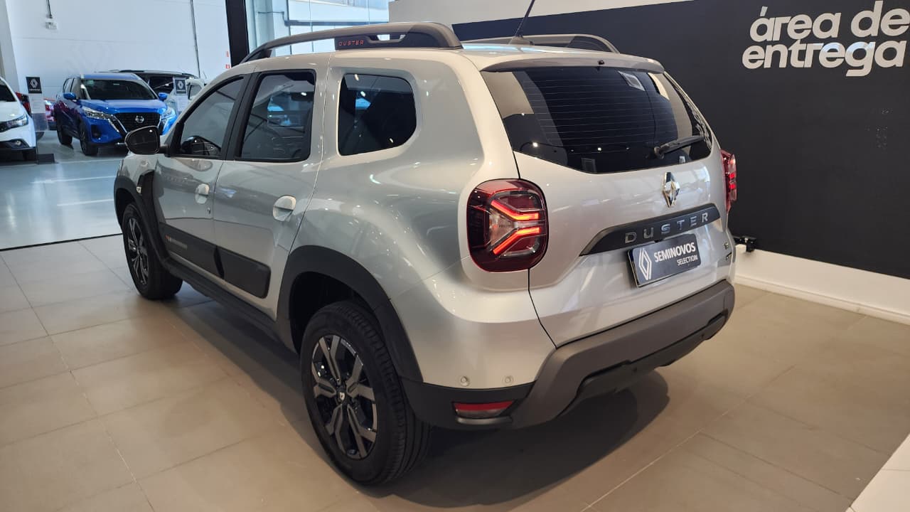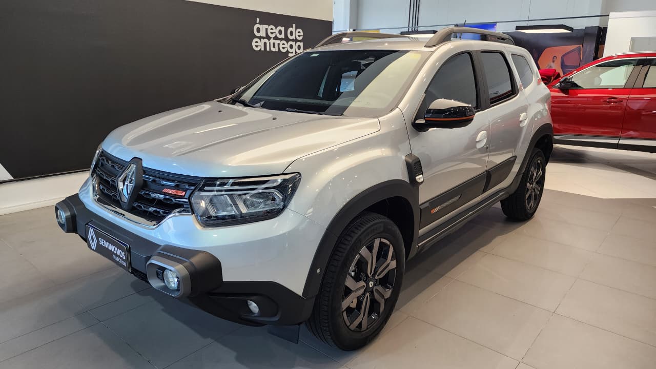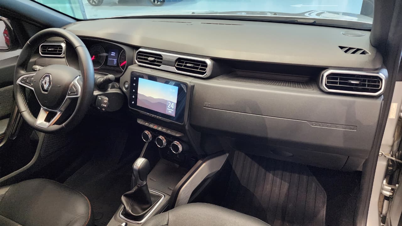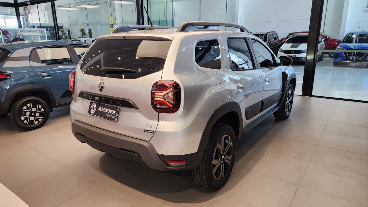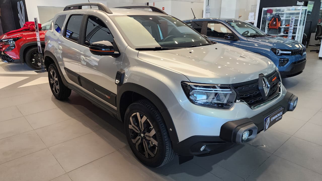 O Renault Duster Iconic Plus 1.3 Turbo 2025 vem completo, com motor 1.3 turbo flex potente, 6 airbags, central multimídia de 8" com Android Auto/Apple CarPlay sem fio, chave presencial com partida por botão, ar-condicionado digital, bancos de couro, câmera 360º, alerta de ponto cego, piloto automático, carregador por indução e itens como sensor de chuva/luminosidade, rodas 17" e rack de teto, sendo a versão topo de linha com foco em tecnologia, conforto e segurança.